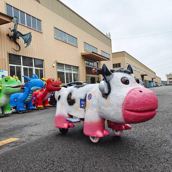 This adorable electric ride-on cow is a delightful addition to any children's play area. Its realistic design, featuring black and white spots, big eyes, and a pink nose, is sure to capture the hearts of young riders. The cow's soft, plush body is gentle on little hands and provides a comfortable ride.